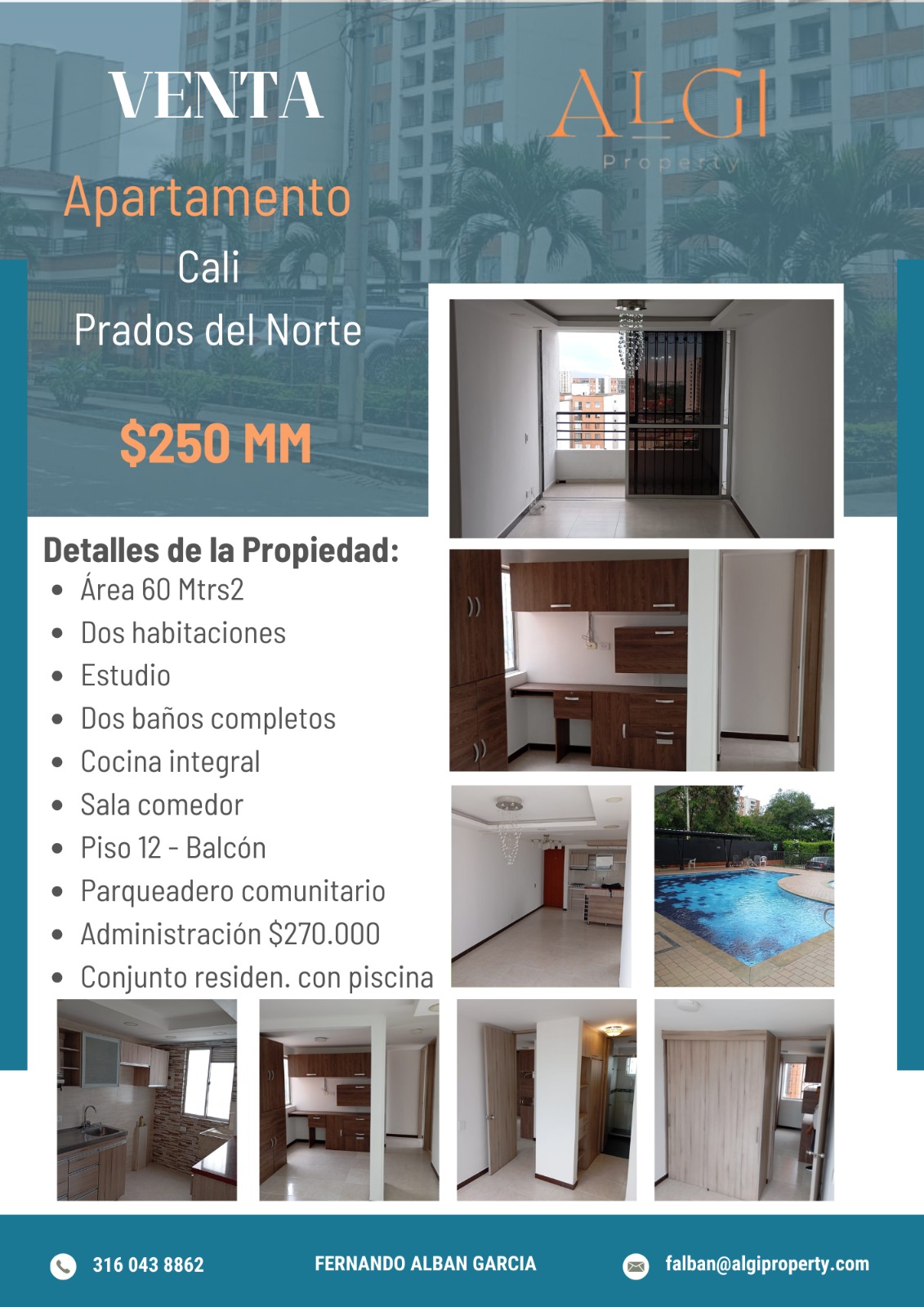 Dos habitaciones, estudio, dos baños completos, cocina integral, sala comedor, piso 12, balcón, parqueadero comunitario, administración $270.000 y conjunto residencial con piscina